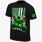 The green and black means one thing - D-Generation X! Be part of the DX Army with this authentic WWE t-shirt worn regularly on Monday Night Raw. Clad in black, the front of the t-shirt has an artist’s impression of members Triple H and Shawn Michaels, and a green tank with the stars and stripes in the background. The sleeve features ‘DX Army’ in green and the reverse details “World’s Biggest Member”.