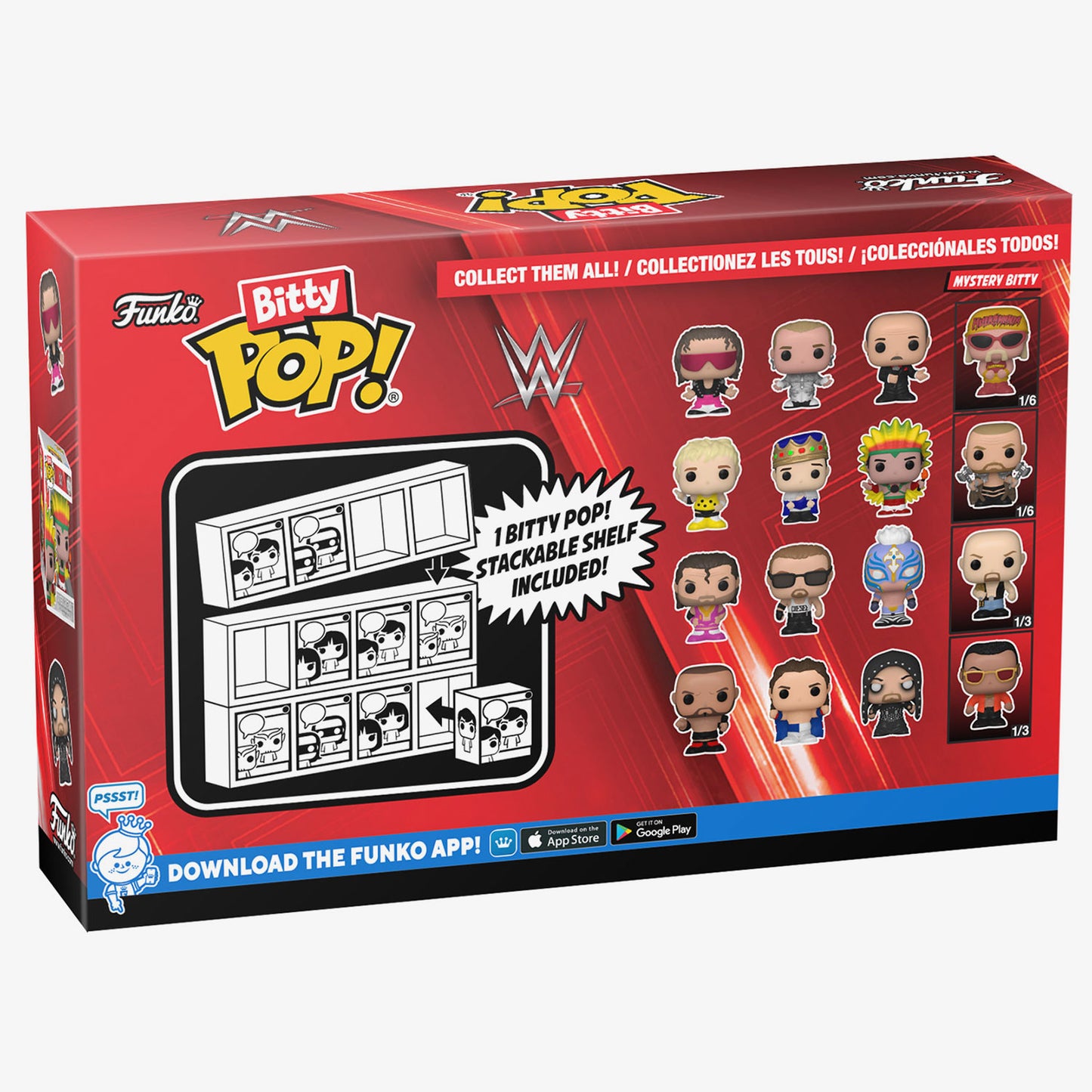 The possible mystery Bitty Pops! are Hyper Rare (1/6) Triple H (Skull King), Hyper Rare (1/6) “Macho Man” Randy Savage, Rare (1/3) Dwayne “The Rock” Johnson, and Rare (1/3) “Stone Cold” Steve Austin™.