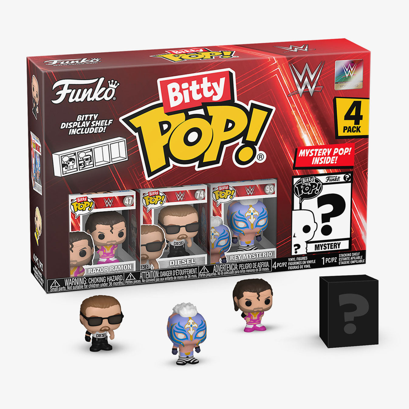 Your favourite WWE Pops! have been shrunk into Bitty Pops! Expand your collection with this assortment of Bitty POP figures featuring some of the most legendary names in WWE as miniaturized figures! This 4-pack includes Bitty POP Razor Ramon, Bitty POP Diesel, Bitty POP Rey Mysterio, and a mystery Bitty POP figure.